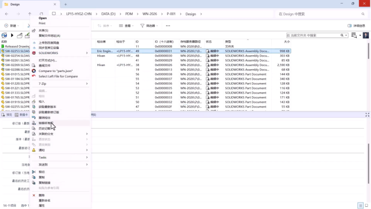 接下来我们将清除缓存以模拟设计工程师离职的情况。传统情况下,本地保存的修改若未检入SOLIDWORKS PDM将会导致数据丢失。然而,SOLIDWORKS PDM 2026突破性的“转移所有权”功能直接解决这一难题,支持对未检入至PDM的数据进行所有权转移。部门经理现可通过右键菜单转移设计工程师已检出的三个装配体所有权。系统在库视图间进行后台同步,使归档服务器能定期维护本地缓存备份,通过所有权转移调用备份并应用增量更改。这是本次版本更新中最重大的改进之一。