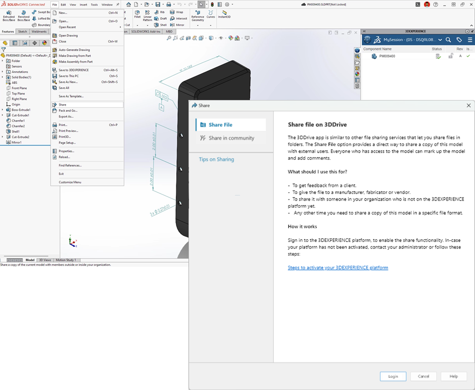 • 现支持直接从 SOLIDWORKS 使用 3DDrive 和 3DSwym 无缝共享信息,从而简化协作,无需担心云存储或数据转换问题。
